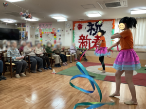 小学校低学年から中学生の新体操のグループが